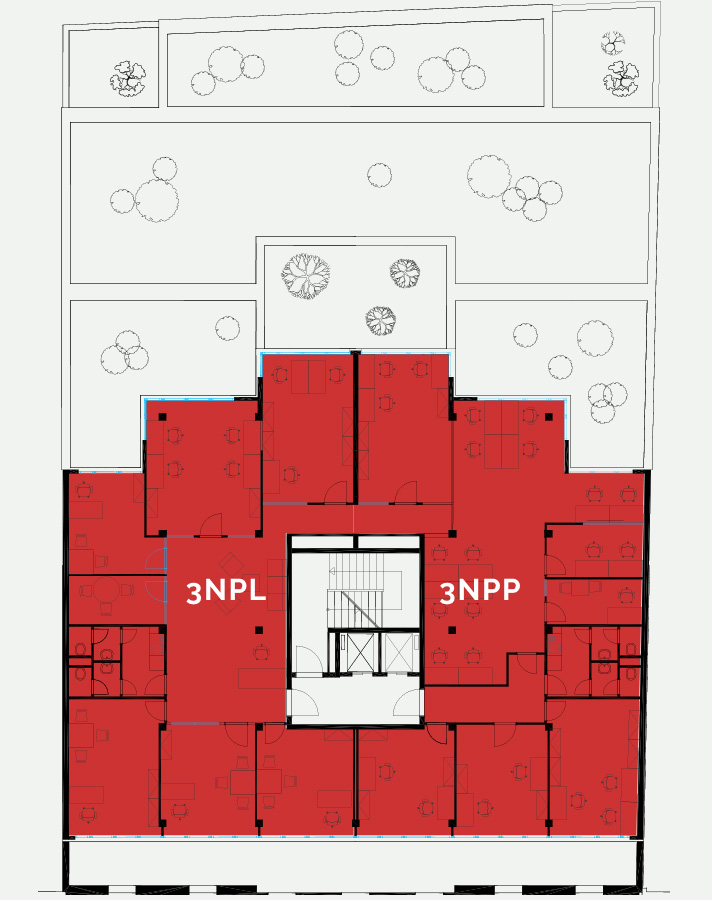 The office offers a large open space with a view in to the quiet courtyard. In the open space you can find also two smaller glassed rooms. On the side facing the main street there are three separate offices. This office includes a kitchen and separate toilets.